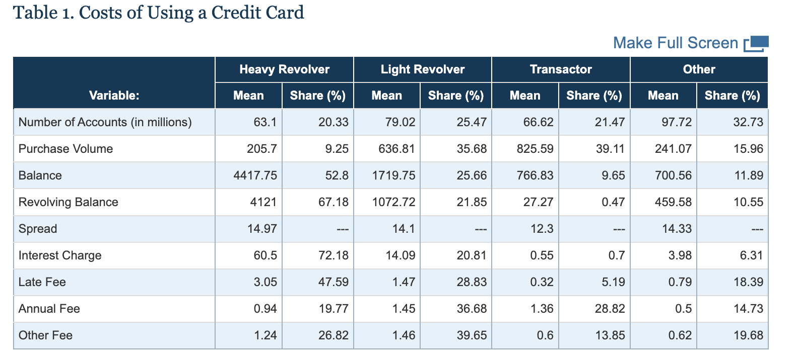 "The bottom half of Table 1 examines how the costs of using a credit card vary with account usage type. The average heavy revolver pays more than 60 [dollars] per month in interest charges, and more than 70 percent of all interest is paid by heavy revolvers. Light revolvers pay 15 [dollars] of interest a month, making up about 20 percent of all interest. Similarly, heavy and light revolvers pay almost 50 percent and 30 percent of all late fees, respectively. By comparison, a higher burden of annual and other fees falls on transactors and light revolvers. Transactors pay almost 30 percent of all annual fees, whereas light revolvers pay 37 percent and heavy revolvers pay less than 20 percent.24 Nevertheless, the majority of annual fees are paid by revolver accounts. The summary statistics are broadly consistent with previous survey-based evidence of the costs of credit cards (for example, Stango and Zinman, 2009) and the biannual report on the credit card market issued by the Consumer Financial Protection Bureau.