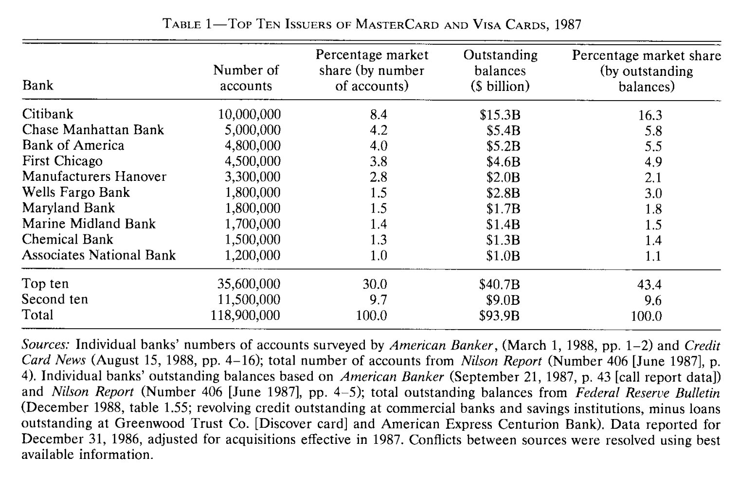 In 1987, the top 10 credit card issuers accounted for just about two-fifths of the market share based on outstanding balances.