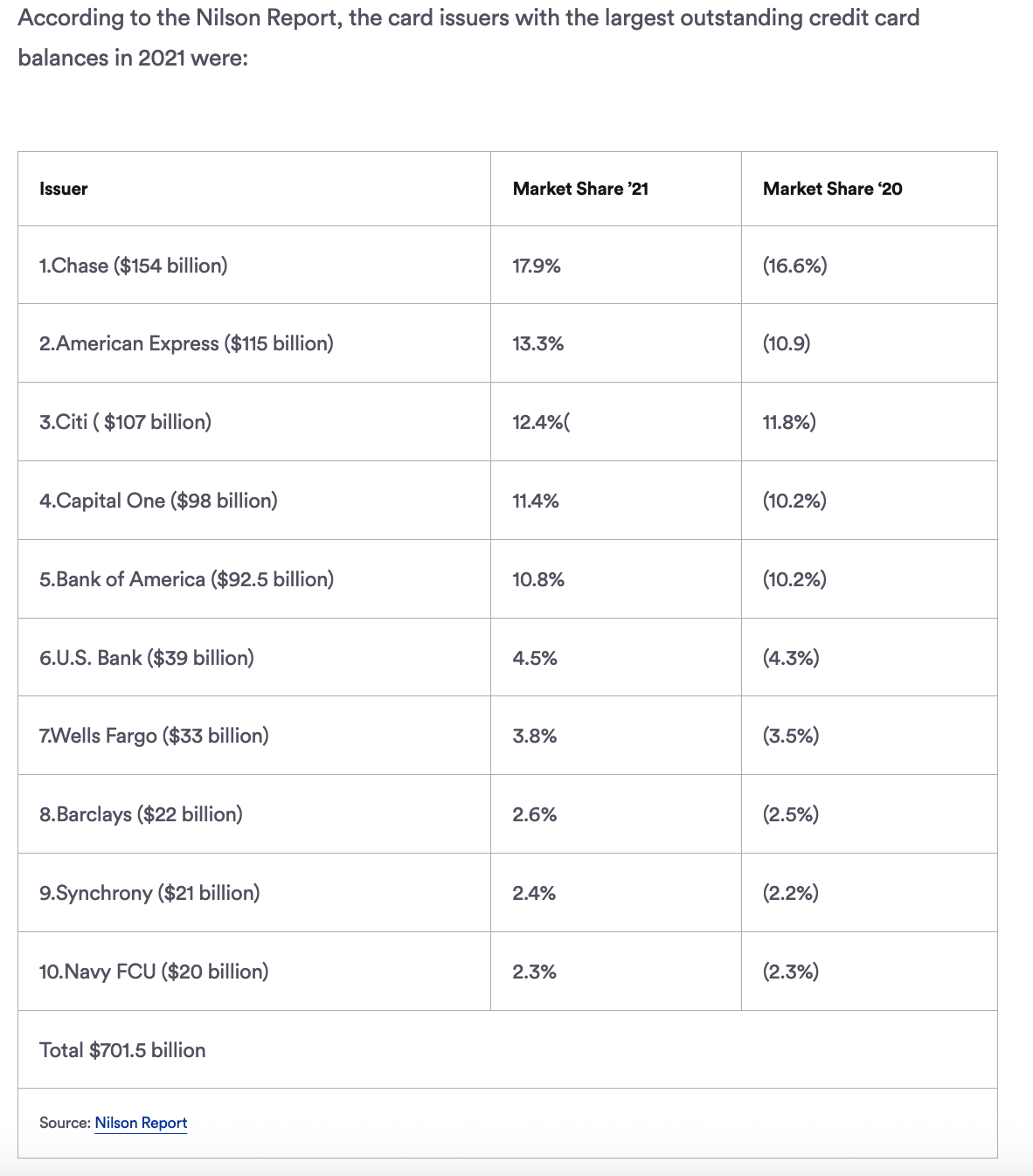 The Nilson Report from 2021 (via Bankrate) suggests ongoing consolidation.