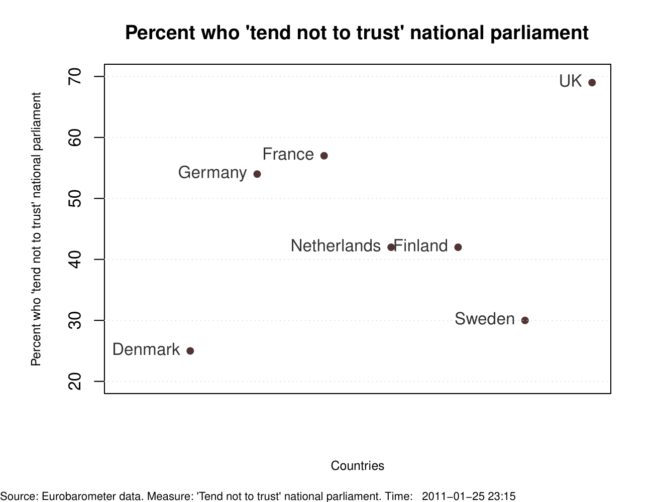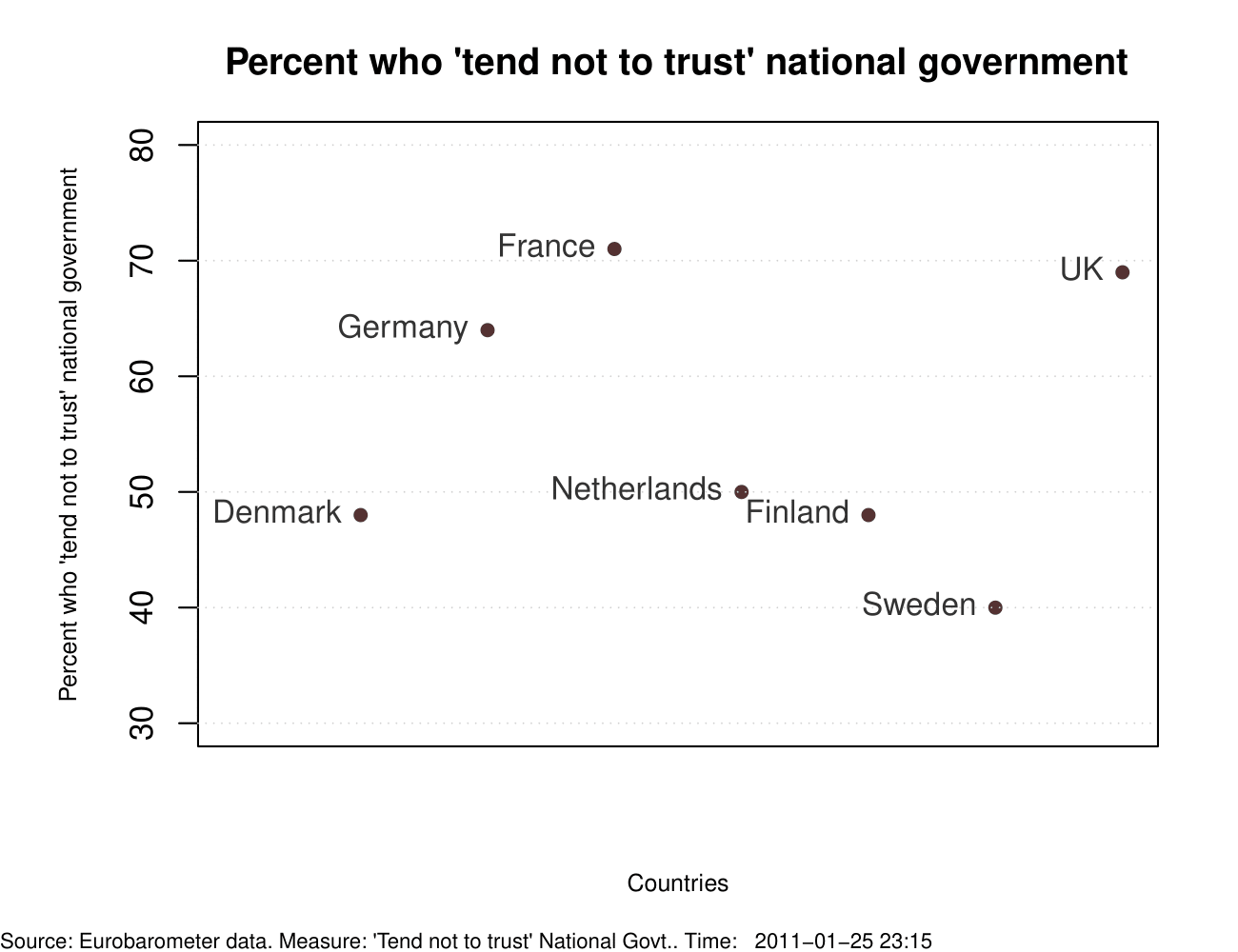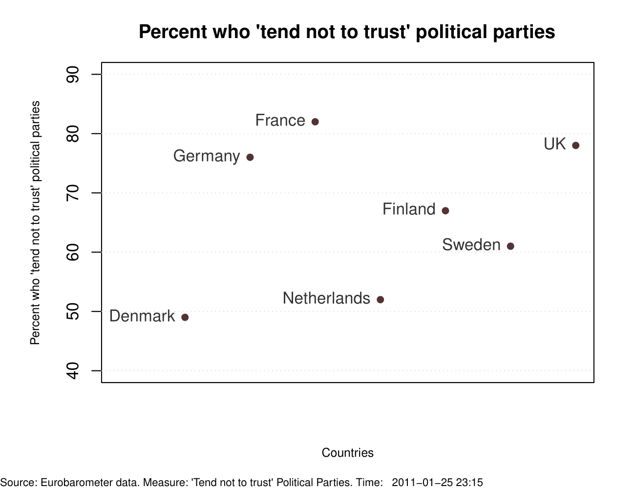 It is sometimes assumed that high levels of institutional distrust in America are peculiar to it. So much so that a variety of theories have been offered to ‘explain’ this peculiarity including, but not limited to, elite polarization, income inequality, polarized media, etc. Empirical support for the ‘American exceptionalism’ however is somewhat less clear – across some major Western democracies (outside of the perennially ‘sunny’ Danes; one may talk about Scandinavian Exceptionalism perhaps), percent who ‘tend not to trust’ [pay attention to the y-axis] national government, national parliament, and political parties is alarmingly high. These high levels raise concerns about the legitimacy of the system.