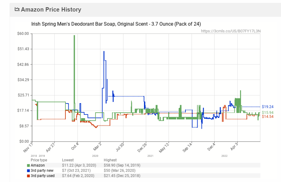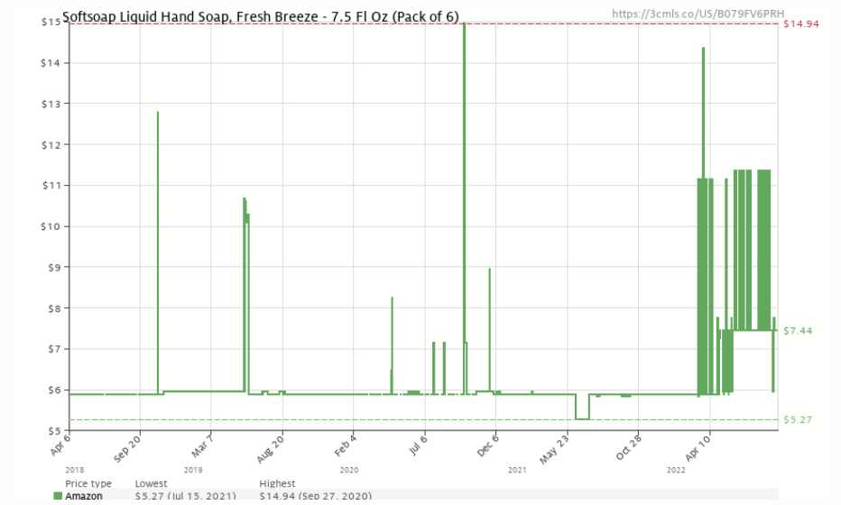 Take another example. Softsoap Liquid Hand Soap, Fresh Breeze – 7.5 Fl Oz (Pack of 6) shows a very high-frequency change between $7.44 and $11. (See also Irish Spring Men’s Deodorant Bar Soap, Original Scent – 3.7 Ounce.)