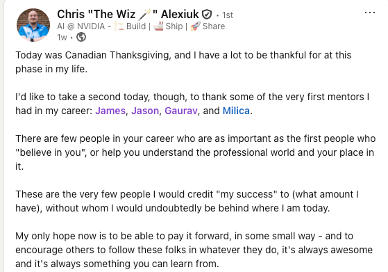 “I wanted to write [to] you and thank you (again) for all the mentorship you have provided me.” — colleague