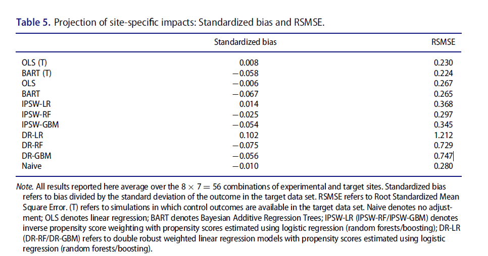 - “The methods with by far the worst performance with regard to RSMSE are the Doubly Robust (DR) approaches, whose RSMSE is two or three times as large as the RSMSE for the other estimators.” (see here, and the relevant table is included below.)