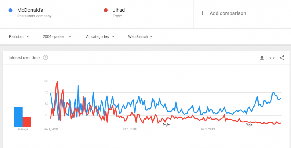 It has been nearly 25 years since the publication of Benjamin Barber’s Jihad Vs. McWorld. So how does the search volume for McDonald’s and jihad compare in Pakistan? Look here for the answer. (I know Barber’s McWorld != McDonald’s.)