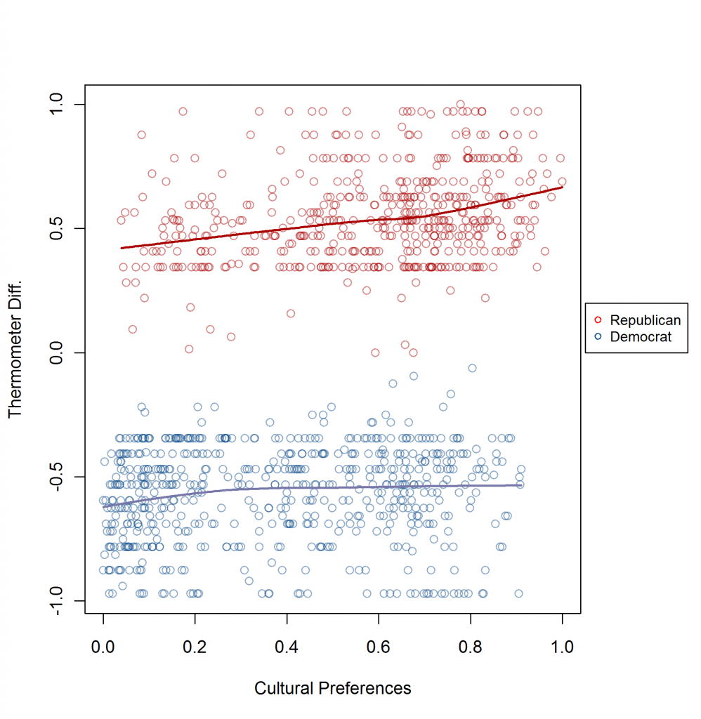 - Conditional on the same preferences, there is a large gap in thermometer ratings. Without partisan bias, same-preferences should yield about the same R-D thermometer ratings. And this gap is not particularly responsive to change in preferences within parties.