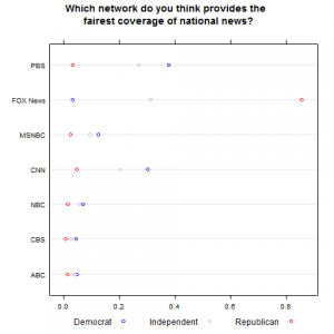 In the 2006 CCES, respondents were asked, “Which network do you think provides the fairest coverage of national news?”. Here's a plot of proportions of Republicans, Democrats, and Independents thinking so about some of the news channels. Compare the results with Perceived media ideology of some news sources.