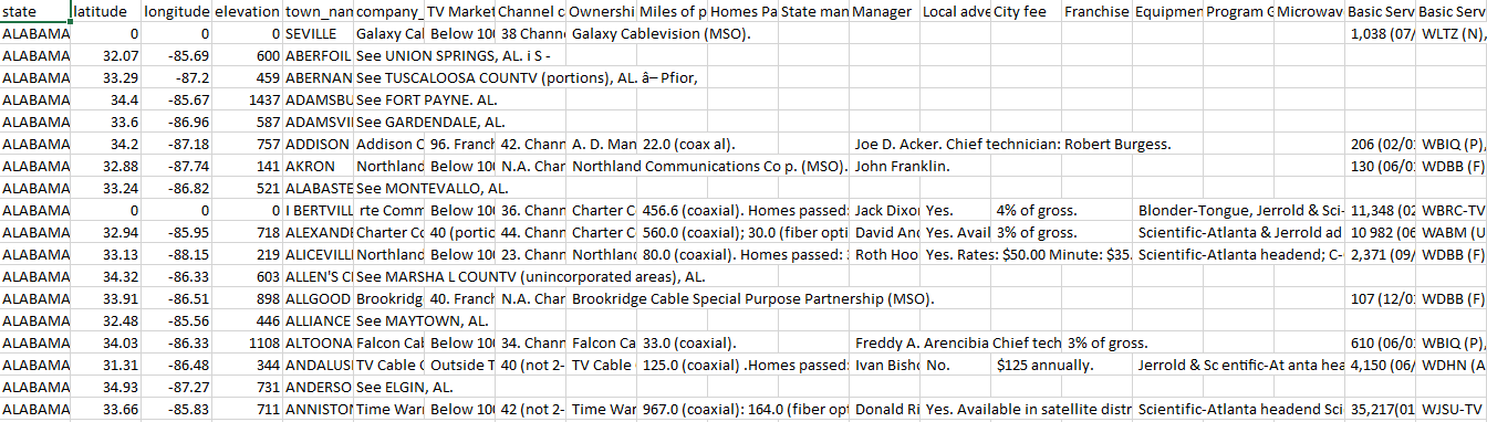 In 2012, I embarked on a similar project, trying to use the data to study the impact of the introduction of Fox News Channel on attitudes and behaviors related to climate change. However, I found the original data to be limited—DellaVigna and Kaplan had used a team of research assistants to manually code a small number of variables for a few years. So I worked on extending the data. I planned on extending the data in two ways: adding more years, and adding ‘all’ the data for each year. To that end, I developed custom software. The data collection and parsing of a few thousand densely packed, inconsistently formatted pages (see below) to a usable CSV (see below) finished sometime early in 2014. (To make it easier to create a crosswalk with other geographical units, I merged the data with Town lat/long (centroid) and elevation data from http://www.fallingrain.com/world/US/.)