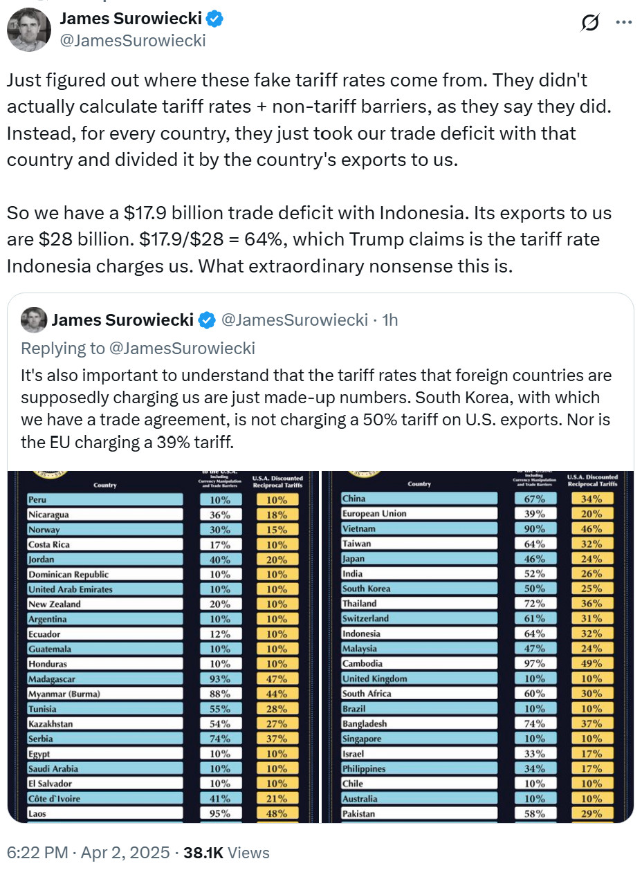So where does this 39 percent number come from? I have no idea. Many people speculated that Trump would count value-added taxes as tariffs, even though they aren’t — European producers selling to the EU market pay the same VAT as US producers, so it doesn’t discriminate and therefore isn’t protectionist. But even if you get that wrong, EU VAT rates are in the vicinity of 20 percent, so you still can’t get anywhere close to 39 percent.